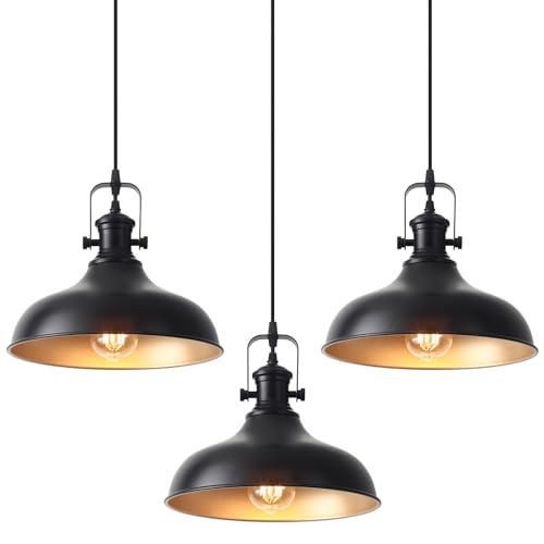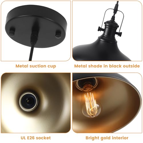 Industrial and Farmhouse Style: Illuminate your space with these stylish pendant lights. These farmhouse pendant lights feature a matte black finish and warm gold interior, creating a comfortable atmosphere and enhancing the decor of any room. They are suitable for creating a modern farmhouse style that complements any decoration and is eye-catching.