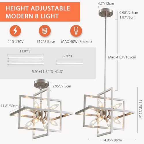 [PERFECT SIZE AND COMPATIBILITY]: Measuring 14.96 x 11.8 x 13.78 inches, this farmhouse chandelier features 8 E12 bulb sockets.It is suitable for use with LED, CFL, HALOGEN, and INCANDESCENT bulbs, with each socket supporting a maximum power of 40 watts (bulbs not included).