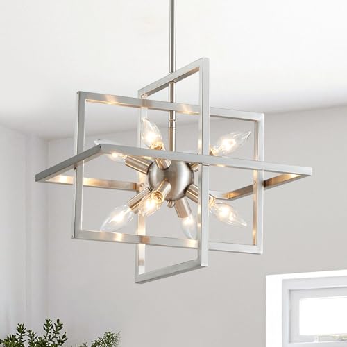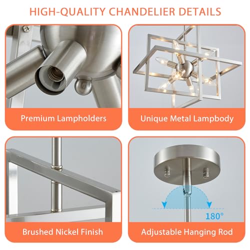 [SIMPLE INSTALLATION]: With all installation hardware attachments and instructions included in the package, this Brushed Nickel Chandelier allows for a quick and easy set up. Please ensure the power is turned off before installation to ensure safety.