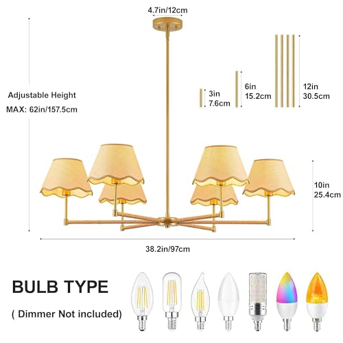 [E12 Sockets] This chandelier requires 6×E12 base bulbs (Max 40W, bulbs not included) and works with LED, incandescent, and CFL bulbs. It is fully dimmable when used with compatible dimmable bulbs and a dimmer switch (not included). You can choose warm white, neutral white, or cool white bulbs to match your preferred lighting ambiance.