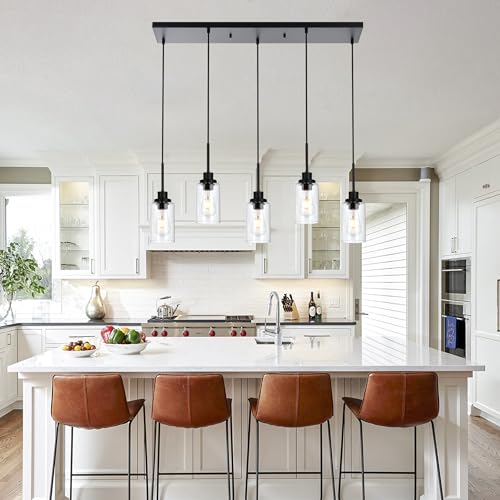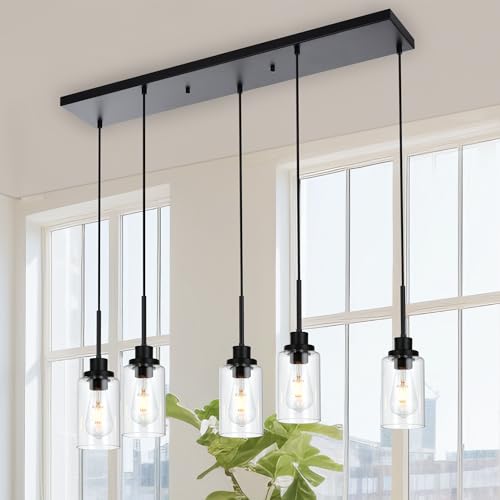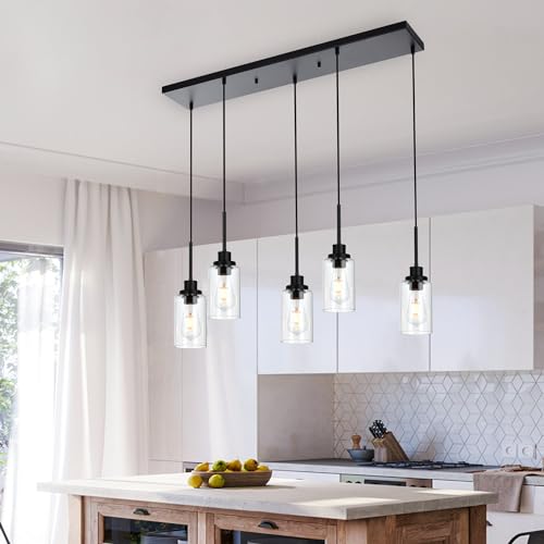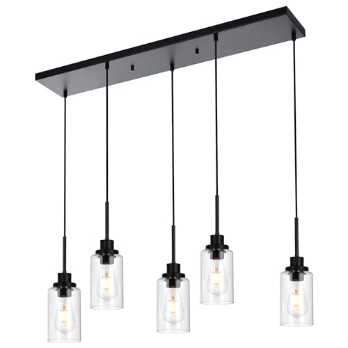 Design: Featuring a row of 5 staggered lights ensconced within cylinder clear glass shades, this dynamic kitchen island pendant brings a dash of contemporary style as it illuminates the heart of your home. A matter black finish gives this fixture a sleek and streamlined look, 5 adjustable wires let you DIY its height to suit your space