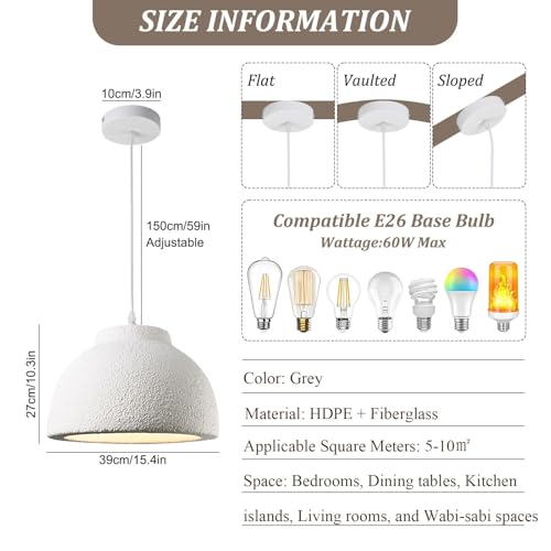 ? Elegant Wabi-Sabi Design: This wabi-sabi pendant light features a smooth, round silhouette with vintage-inspired lines and a subtle, grainy finish that mimics the texture of cement. Measuring 39x27cm, its compact and elegant form embodies rustic beauty in a serene way. Finished in a soft light gray, it casts a warm, diffused glow that creates a romantic and comfortable atmosphere, offering a timeless Japanese pendant light aesthetic.