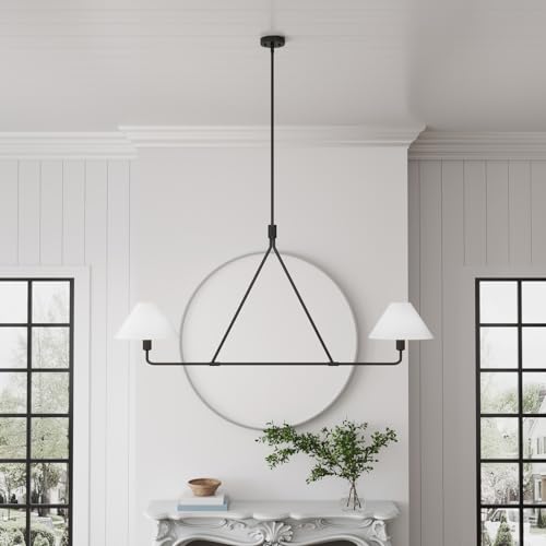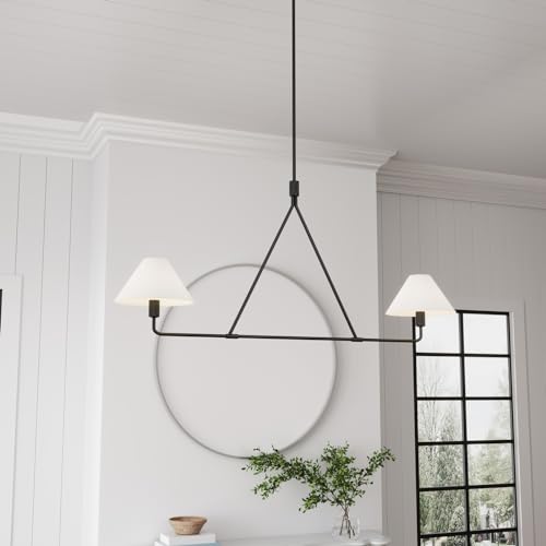 ?Linear Chandelier?The modern kitchen island lighting is built with a durable black metal body and high quality white fabric shades. Each arm is topped with a candle-style sconce, diffusing light for a warm glow through fabric drum shades. The dining room light fixture perfectly blends transitional and modern characters.
