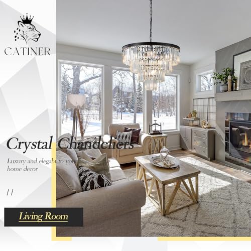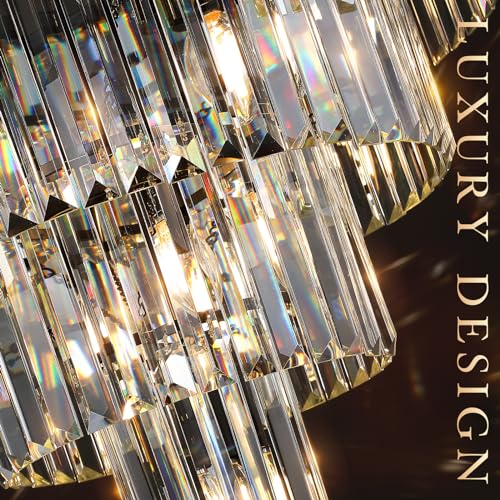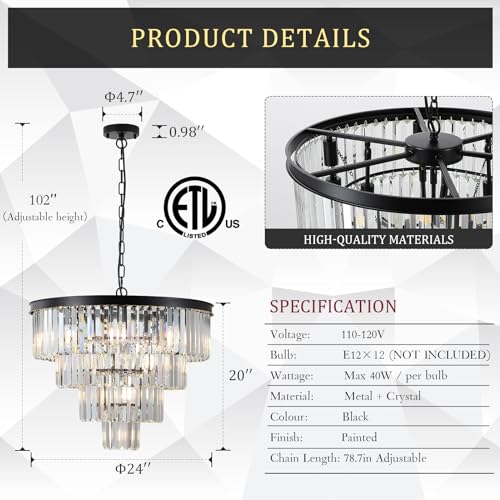 Dimension of this statement contemporary chandelier is D20.5” H20” with adjustable chain max to 78.7”, great for high ceiling foyer, staircase and living room, it requires 12 E12 light bulbs(not included) in 40W max for each bulb, if you need dimmable function of the crystal pendant lighting, led dimmable light bulbs and wall dimmer switch are needed(NOT INCLUDED), new design of metal chain to connect each ring, you can also adjust the length of each tier crystals