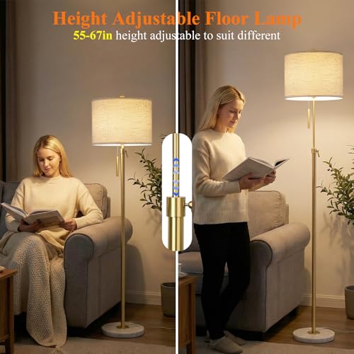 ?54“-67” Height Adjustable Designed to Save Space?: this Adjustable Height standing lamp equipped with right-sized marble base, fits well into any narrow corners.This sleek and modern floor lamp features a real white marble base accent at the bottom and we have equipped this floor lamp with a custom bulb to achieve 3 way dimming, it's easy to control by the pull chain.