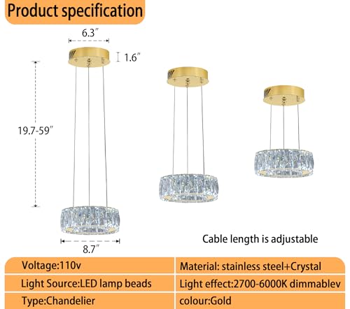 ?? Crystal Pendant Light Size?:Ring Chandelier Size Diameter: 8''; Flush mount canopy: dia7.9''. Maximum Hanging: Height Adjustable from 20'' to 59''. The cable length and crystal ring shape can be adjusted. Sturdy in construction and durable for daily use. Ideal for sloped/low/Middle layer. Perfect for Living Room, Bedroom, Dining Room, Kitchen, Bathroom, Foyer, Hallway, Office, etc.Please ensure dimensions of this crystal chandeliers is fit for your prepared space or not.