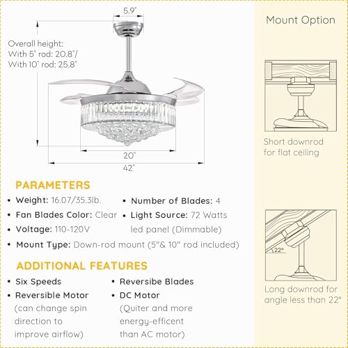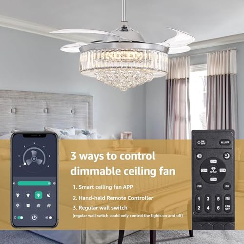 ?Suitable for ALL Seasons?: This fandeliers with remote use the reverse DC motor, allows this crystal ceiling fan to have the ability in addition to using all its functions on a daily basis, you can also use its reversing function on cold days to expel cold air.
