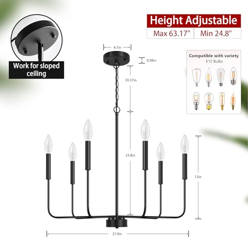 ?Adjustable Height?The diameter of the black chandelier is 27.9'', canopy diameter is 4.7'', the length of the candle-shaped stem is 13'', the length of the adjustable hanging chain is 39.37'', the length of hanging rod is 23.8''(2 rods). The height of the ceiling hanging light can be adjusted from 63.17'' to 24.8'', can be used in a variety of spaces.