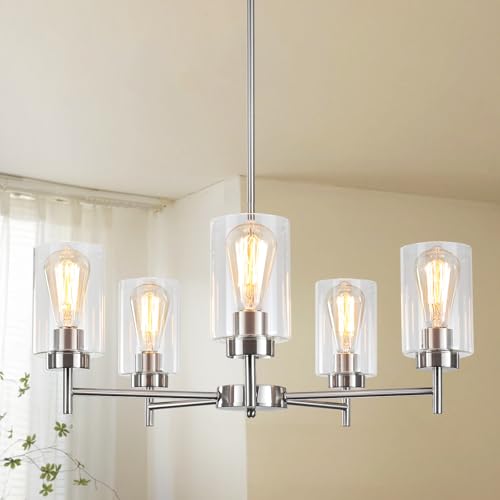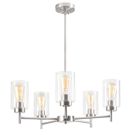 Contemporary Chandelier With Clear Glass Shade: This brushed nickel dining room light fixture is made of cast iron in brushed nickel finish with 3mm thin clear glass shade, anti-rust, durable and better corrosion resistance,no need to worry about getting oxidation and color fading. The cylindrical thick clear glass shades of this glass chandelier diffuses the light softly, add an exquisite luxury and modern aesthetic to your house.