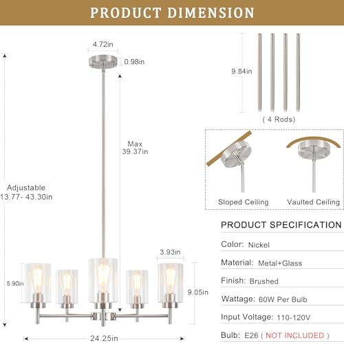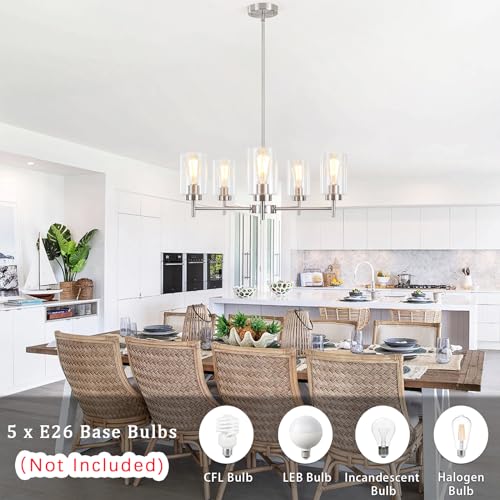 E26 Base & Dimmable: The modern dining room light fixtures over table require 5 x E26 bulb base. Max wattage: 60W. Compatible with LED, CFL, halogen, incandescent or Edison chandelier brushed nickel. (????Bulbs Not Included). Also, this 5 light dining room chandelier lighting fixtures ceiling can be dimmable when you used with a dimmable bulb and compatible dimmer switch (Dimmer Switch Not Included).