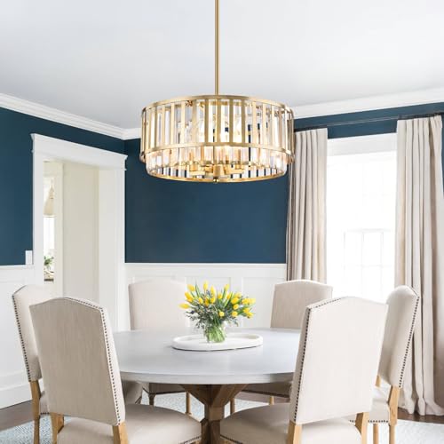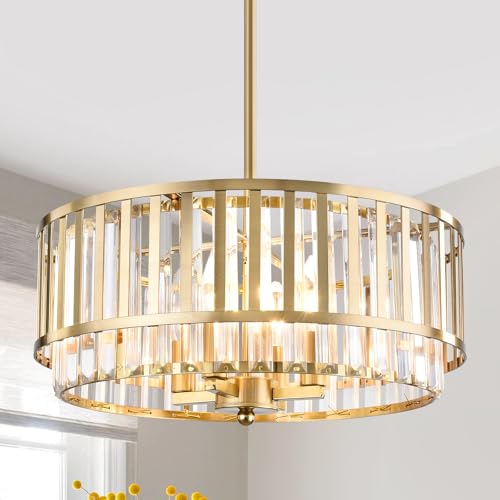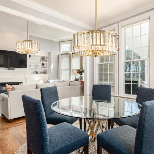 Modern Luxury Style: This hanging pendant light fixture drum metal shade with a brass finish, adding a sleek modern farmhouse design paired with Transparent long crystal shade, it exudes a comfortable glow that complements both noble and traditional decors