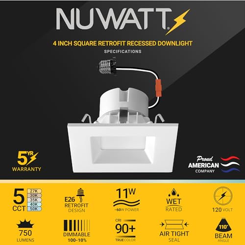 High CRI LED – NuWatt’s square can lights provide superior color representation of objects. Our 4 inch LED square recessed can lights feature a premium CRI>90 rating, ensuring accurate, natural-looking colors.