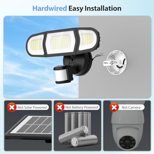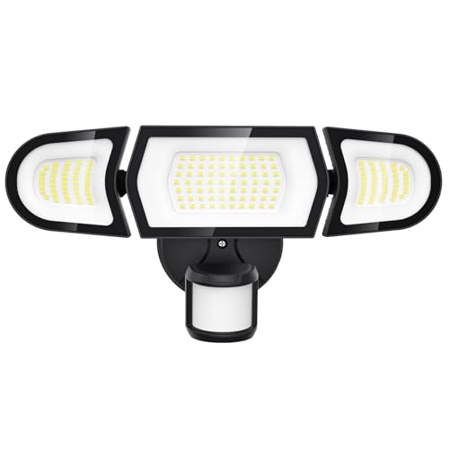 Light Up Wide Coverage: This 9,000 lm motion lights for outside lights up yards, garages, driveways, and more. Its 3-headed adjustable design provides 270-degree coverage, illuminating up to 1350 square feet to enhance home security at night