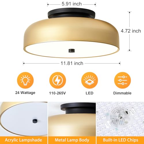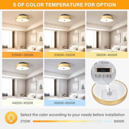 Dimmable: This gold LED ceiling light fixture can adjust the brightness from 10% to 100% at will. It can be adjustable in 5 color temperatures (2700K-6000K) by the switch around the built-in LED chips