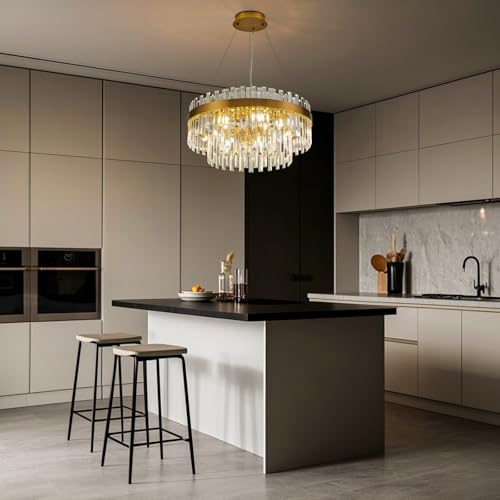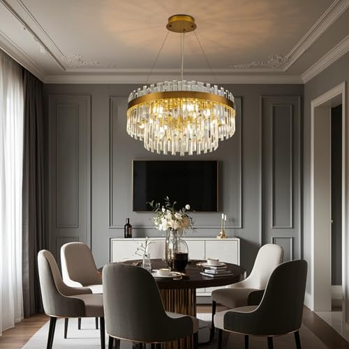 Dining RoomLuxury Crystal Chandelier:This Round gold crystal chandelier is Crafted from high-quality K9 crystal strips and a gold-plated stainless steel body, this chandelier elegantly decorates modern homes, blending stylish luxury with a retro atmosphere