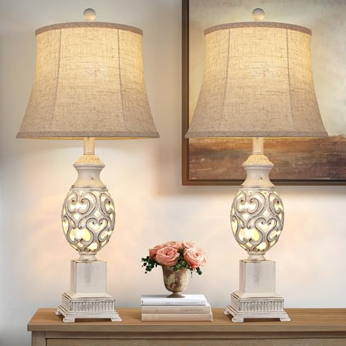 Tall traditional table lamp: each lamp is 28" high overall. Traditional bases in a vintage whitewash finish. Sophisticated bases ideal for French Country or cottage decor