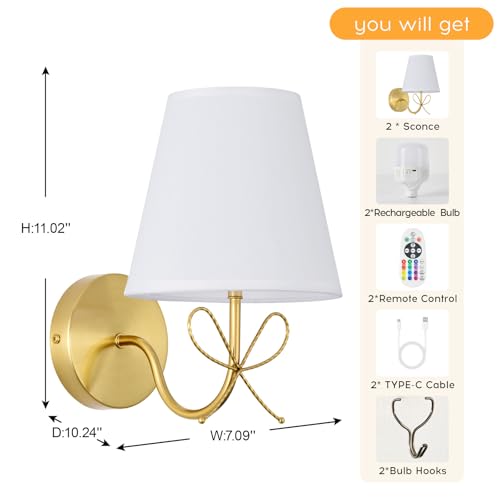 Elegant & Renter - Friendly Design?The gold wall sconces with a bow, featuring a gold finished frame and white fabric shade, combine sophistication with practicality. The gold finished frame with a bow fits into bedrooms, living rooms, or hallways, especially great for girls' or kids' rooms. Backed by a 2 - year warranty and dedicated customer service for all your rechargeable wall light needs.
