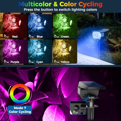 7 Modes Color Changes: The solar colored landscape spotlights has 7 lighting modes, which can create a romantic atmosphere at festivals, parties or daily occasions. Each time the button is pressed, the color mode changes in the order of Red ? Blue ? Green ? Purple ? Cyan ? Yellow ? RGB Color Changing. The last thing you press is the multiple color cycle mode