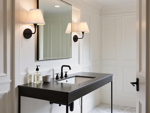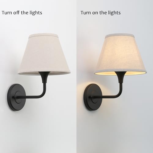 Rustic vintage single wall sconces with matte black metal pole and white cloth shades soften the light and create a cozy and warm atmosphere in any space