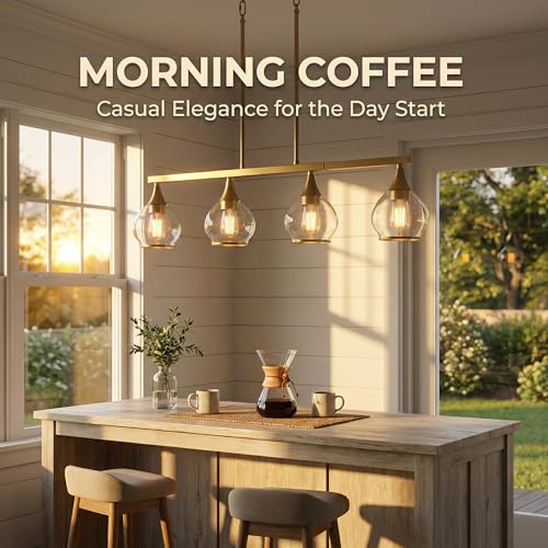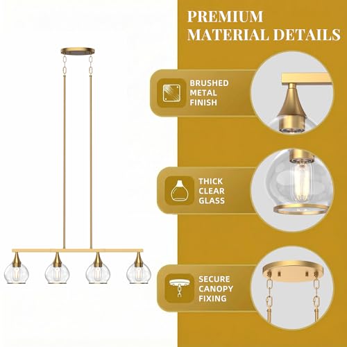 4-Light Linear Gold Chandelier for Kitchen Island?Modern brushed gold linear pendant light featuring four clear glass globe shades. Ideal for illuminating kitchen islands, dining tables, and home bars with elegant, even lighting. Perfect blend of modern style and timeless charm.
