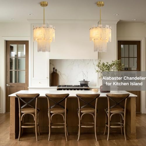 ?Unique Material and Craftsmanship? Alabaster Chandelier Crafted from premium Spanish Natural Alabaster, each piece undergoes meticulous grinding and polishing to preserve its original texture and distinctive veining. The 2 Tiers design complements the sturdy gold-toned metal frame, housing three E12 bulbs that emit a warm glow.