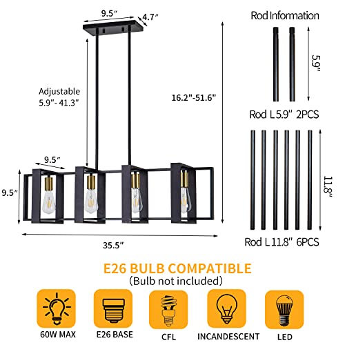 ?EASY ADJUSTABLE HEIGHT?: The size of black chandeliers for dining room is L 35.5 inches X W 9.5 inches X H 51.8 inches (Adjustable), And includes 6pcs x11.8 inches and 2pcs x5.9 inches rods. You can adjust the hanging height by the rods to 5.9", 11.8", 23.6", 35.4", and 41.3" .