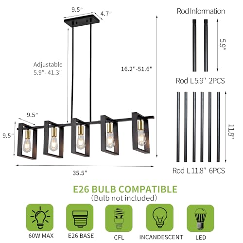 BULBS AND SAFETY: island lights for kitchen is equipped with 5 E26 sockets, Bulbs NOT Included, widely compatible with LED, CFL, incandescent, halogen and edison bulbs. Each bulb recommended maximum 60W. The bulb socket and power cord are UL Listed.