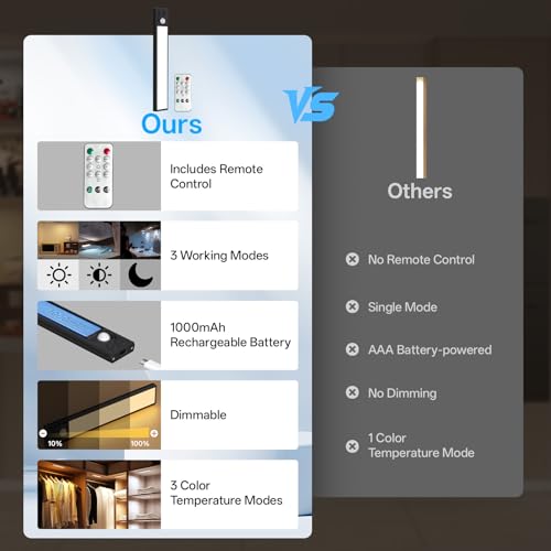 Under Cabinet Lighting Wireless with Remote Control:One remote control can easily control multiple lights, brightness adjustment, switching color temperature, switching between constant brightness and sensing mode, 15/30/60 minutes timer off. Planning to use them in different rooms? Each light has buttons so you can still adjust the settings individually