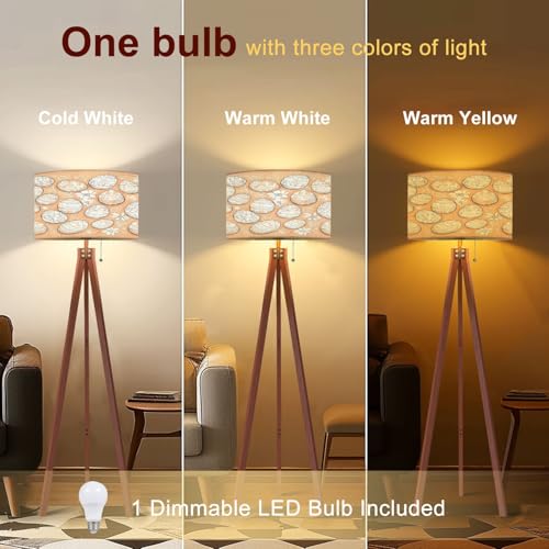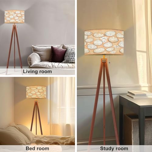 QFHOMTEOL Wood Tripod Floor Lamp Seamless Doodle Warm Peach Beige Used for Modern Standing Lamp Linen Lampshade Dimmable Tall Lamp Mid Century Floor Lamp for Living Room Bedroom