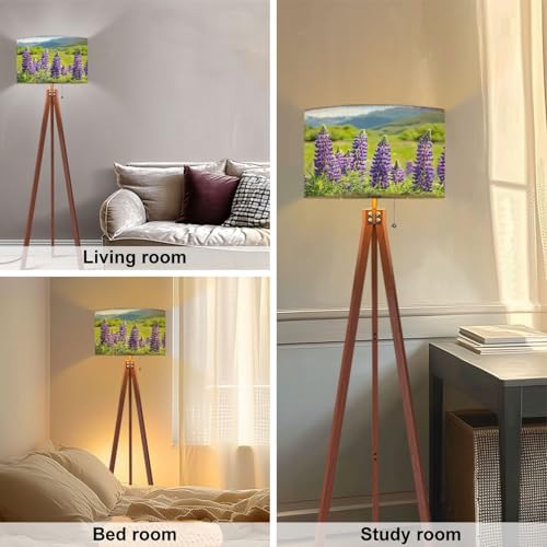 QFHOMTEOL Wood Tripod Floor Lamp Wild Lupins Arrowtown New Zealand Modern Standing Lamp Linen Lampshade Dimmable Tall Lamp Mid Century Floor Lamp for Living Room Bedroom