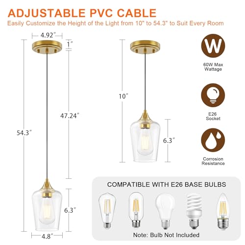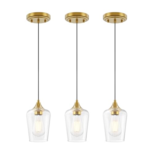 1: Elegant Design & Quality Materials: Glass pendant lights kitchen island. Farmhouse-style pendant lights featuring a brushed gold finish and wine clear glass shade that adds a sophisticated touch to any room's decor.