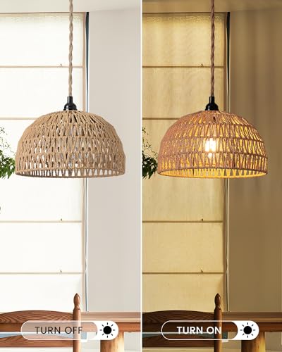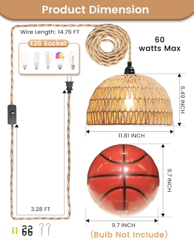 ?Rattan Hanging Lamp With Plug In Cord?The hanging pendant light is design with standard medium-size E26 bulbs( Bulb is NOT include), allows you to use kinds of bulbs type, this rattan light plug-in cord also allow to adjust the hanging height to fit your lighting ambiance in any space,with an on/off switch 3.25ft away from the plug, easy to control the basket pendant light without to bend over.