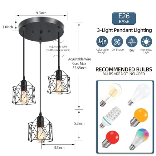?3-Light Pendant Light Fixture with E26 Base?This hanging pendant light fixture requires 3xE26 base bulbs, (Max 60W for each light, Bulbs not included). You can update the bulbs to enjoy the atmosphere its lighting and flair exudes. When the dimmer switch is connected and the dimmer bulb is used, it can be fully dimmable. It's also up to you whether you want a dimming function, as this dining room pendant light fixtures work well with most dimmers in the US.