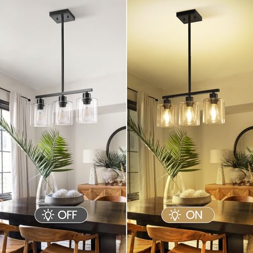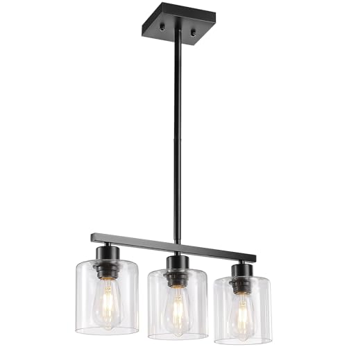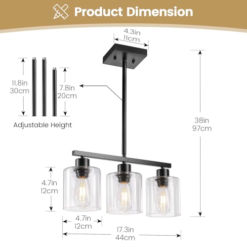 [Height Adjustment] You can freely adjust the height to your preference with the included three light poles (12 inches, 12 inches, 7.8 inches), allowing for customized installation to suit your needs. The rocunsi pendant lights feature a sleek black finish and durable clear glass lampshades, adding a stylish and elegant ambiance to any space. Ideal for kitchen islands, they provide a soft and comfortable light.