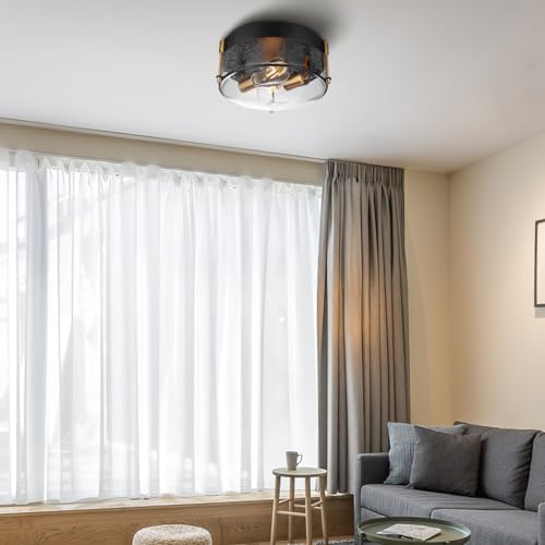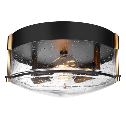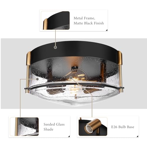 Dimensions and material: This flush mount ceiling light exudes elegance with its graceful circular design, boasting an ample 11.81-inch diameter and a 5.75-inch height. It's crafted with a combination of seeded glass and a stylish black metal frame, creating a harmonious blend of form and function.