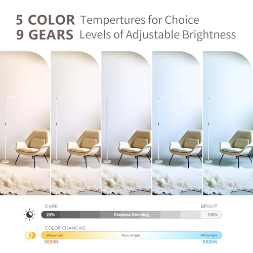 Dimmable Floor Lamp: 9 level brightness(20%-100%) and 5 color temperature(3000K-6500K), easily adjust the intensity to suit your needs, from soft ambiance to bright focus. Perfect tall LED light for reading, working, piano practice and home lighting.