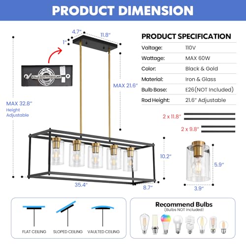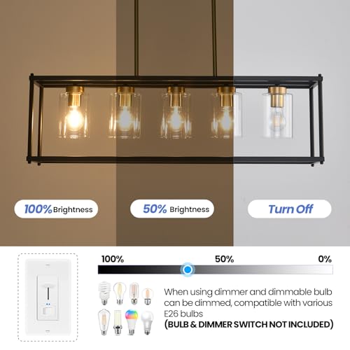 ????[Size & Bulb Requirement]: Overall measures: island lights for kitchen is 35.4"(L) x 8.7"(W) x 10.2"(H), this island lights for kitchen support E26 medium-base bulbs, 60-Watt max. for this island lights(Bulbs NOT Included), Could be fully dimmable when using with dimmable bulbs and dimmer switch