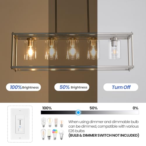 ????[Size & Bulb Requirement]: Overall measures: island lights for kitchen is 35.4"(L) x 8.7"(W) x 10.2"(H), this island lights for kitchen support E26 medium-base bulbs, 60-Watt max. for this island lights(Bulbs NOT Included), Could be fully dimmable when using with dimmable bulbs and dimmer switch
