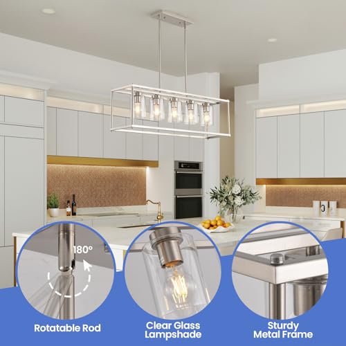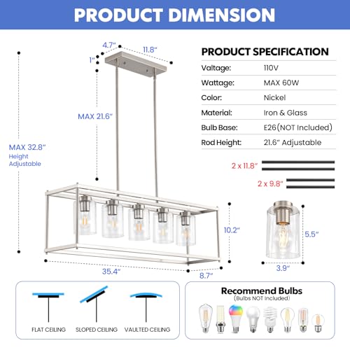 ?[Craftsmanship&Farmhouse Dining Room Light Fixture]: This classic rectangular design features a 35.4-inch linear metal frame with a brushed nickel finish. It is ideal for modern, industrial, or farmhouse spaces and elevates elegance in dining rooms and kitchen islands.