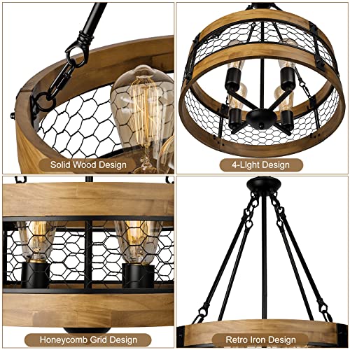 ?[RUSTIC FARMHOUSE LIGHT FIXTURES] This 4-Light farmhouse chandelier consists of retro solid wood and metal. Handcrafted solid wooden rustic chandelier are more eco-friendly and natural. This round farmhouse chandelier is full of elegant retro country rustic industrial chandelier styles. And this wood light fixture will add a natural and retro flavor to your dining room,kitchen island,living room,bedroom, dining room over table, foyer, entrway, etc.