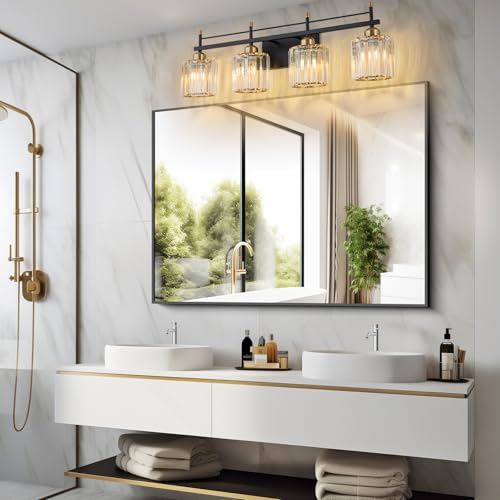 SPECIFICATION:Length: 28.3 inch, Height: 9.1 inch. Crystal lampshade: 4.6" L * 4.6''W*4.8" H.This black and gold 4 light vanity fixture can bring a different and unique feeling to your bathroom.