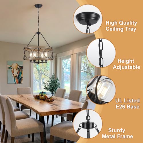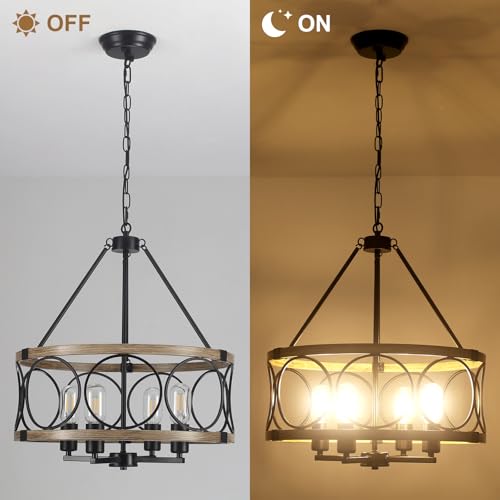 ?Industrial Hanging Lights?This rustic dining room chandelier composed of a modern matte black metal and a vintage oak grain frame, show the beauty of modern home and country vintage, creat a warm and retro to your home decor. Ideal for dining room, kitchen island, living room, bedroom, foyers, and hallway.