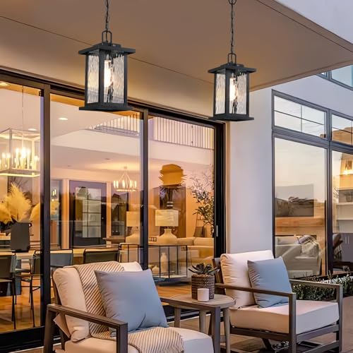 [ EXQUISITE OUTDOOR HANGING LIGHT ] - Add elegance to your home with our outdoor hanging light in a modern black finish with water ripple patterned glass design. Mixing industrial and farmhouse styles, it creates the perfect balance of modern and rustic. The clear, rippled glass creates a soothing vibe while illuminating the space.