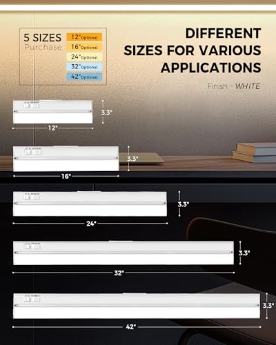 ?Multiple Size Choices for Perfect Fit? It is available in a range of sizes—12", 16", 24", 32", and 42"—to fit cabinets of various lengths. With these options, you can choose the ideal size to match your cabinet layout, providing flexible installation and reliable under cabinet lighting for any kitchen or workspace.