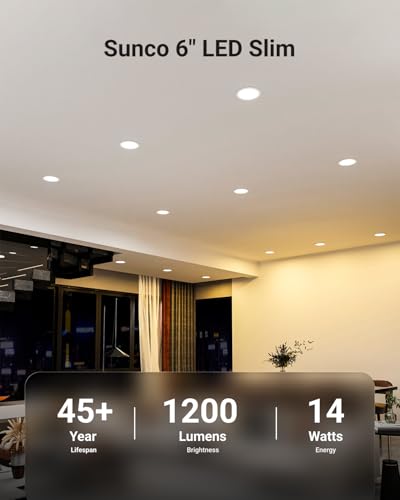 Sunco 12 Pack Recessed Lighting 6 Inch LED, Canless Ceiling Lights Slim with Junction Box, 850 LM, 14W (100W Equivalent), 6000K Daylight Deluxe, Dimmable, Wafer Thin, 50000 Lifetime Hours ETL.