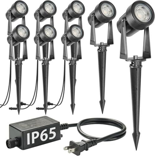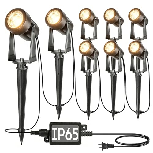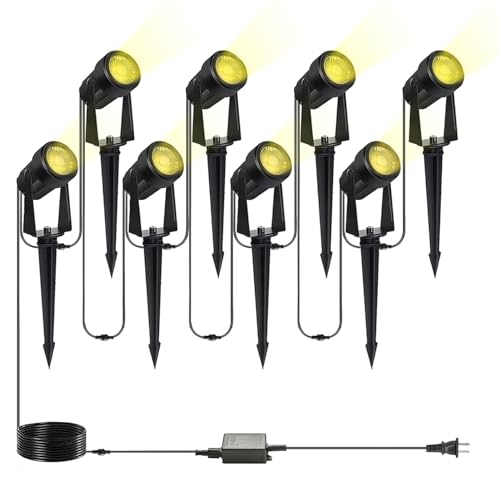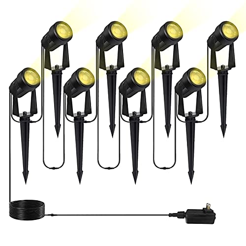 ?Easy to Install, Plug and Play?Wired landscape lighting kits are includes 8 spot lights, 1 transformer and cables for fast and easy set up to brighten your yard. Just stick into the ground or use the included screws to mount on the wall and plug it into outlets, simple to install, hassle-free to use