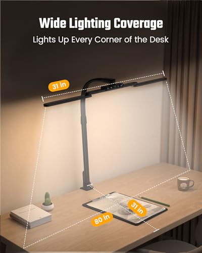 ?Full Desk Light Coverage?With a 31-inch long head and a super bright 1200 lm light, this desk lamp evenly illuminates your entire workspace (80”L×31”W). It ensures your keyboard, paperwork, or crafting area is well-lit, just like in daylight.