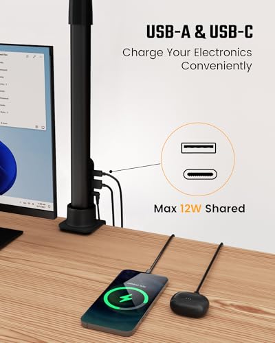 ?2 Built-in USB Ports?This desk lamp's base includes a USB-A and a USB-C port, allowing you to charge your phone and other devices like earbuds or smartwatches directly. This design helps keep your workspace tidy and makes charging easier, whether you're working or reading.