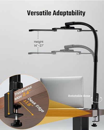 ?3 Fold Head & Gooseneck Design?This desk clamp light has 3 adjustable lamp heads that provide customizable lighting for your needs. The side lamps can fold up to 270° to match your screen setup, ensuring no direct light shines into your eyes. Flexible gooseneck adjusts in height from 14 to 27inches and the base can ratates 360° ?allowing you to position it perfectly for large monitors or small laptops.