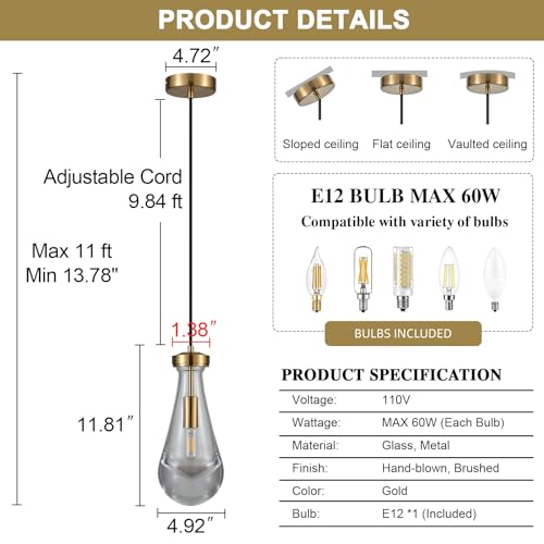 ?Compatible with Various Bulbs?Glass Pendant Light features compatibility with dimmer, and 1 E12 bulbs base (Bulbs Included). Kitchen Lighting Fixtures will create an enchanting light that illuminates your space with a cosy and warm atmosphere.This is perfect for kitchen islands, living rooms, hallways, foyers, bars, or cafes.